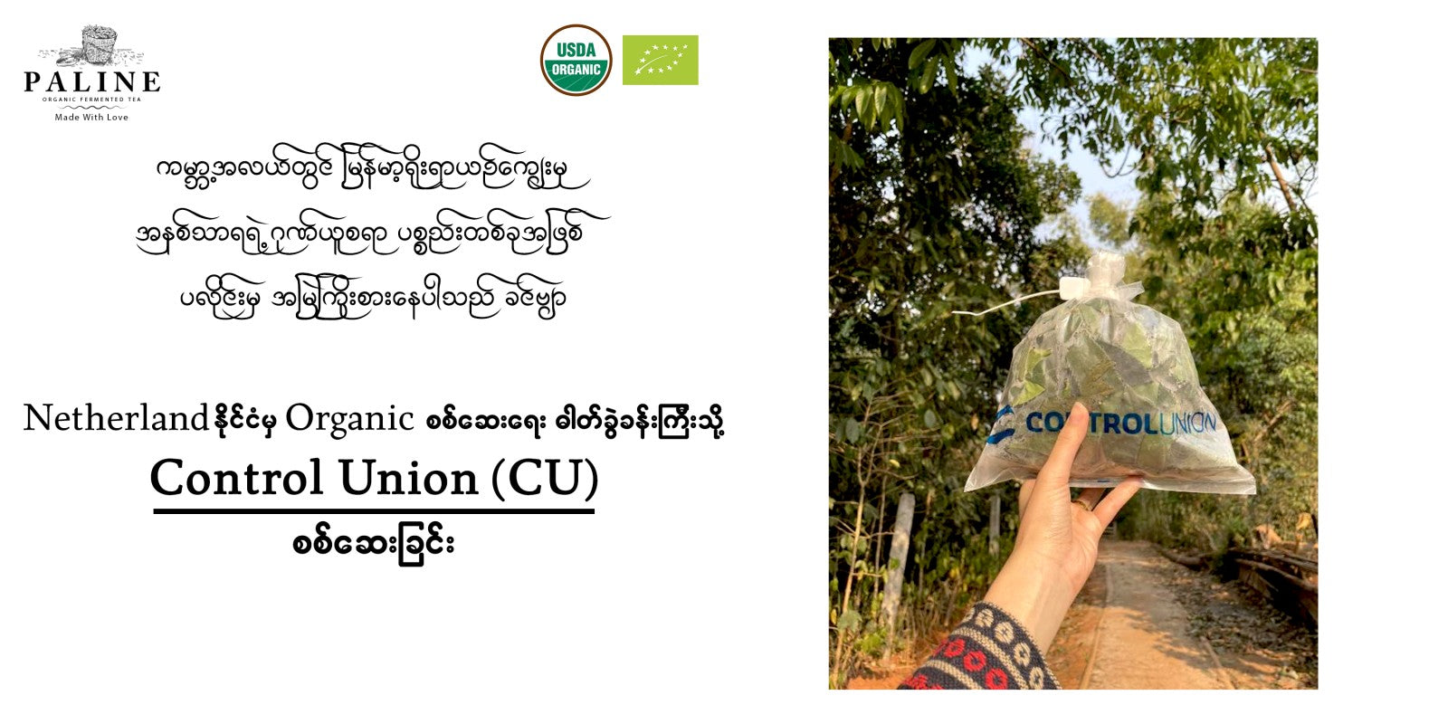 ၁ဝဝ % organic ပလိုင်းလက်ဖက်။ စိုက်ပျိုးချိန်ကစပြီး ထုတ်လုပ်တဲ့ အဆင့်ဆင့်ကို စနစ်တကျစစ်ဆေးမှု ခံယူထားပြီး၊ တာရှည်ခံဆေးဝါးတွေ၊ ဓာတုဆေးဝါးတွေ၊ ပေါင်းသတ်ဆေးတွေ၊ ပိုးသတ်ဆေးတွေ လုံးဝအသုံးမပြုထားခြင်း။ လက်ဖက်အပါအဝင် ပါဝင်ပစ္စည်းအားလုံး organic ဖြစ်ခြင်းတို့ကြောင့် ကမ္ဘာ့အသိအမှတ်ပြု EU နှင့် USDA မှ Organic လက်မှတ်ရရှိထားတဲ့ မြန်မာနိုင်ငံရဲ့ တစ်ခုတည်းသော ၁ဝဝ% organic လက်ဖက်ဖြစ်လာခဲ့ခြင်းဖြစ်ပါတယ်။