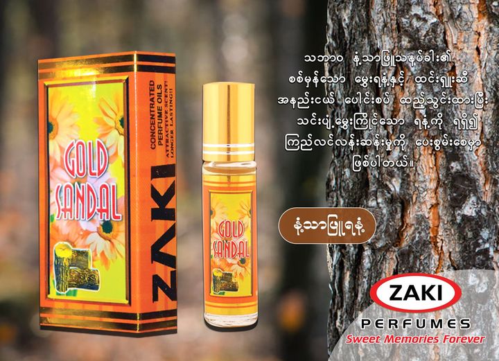 ZAKI နံ့သာဖြူရနံ့ ရေမွှေးအဆီ။ စိတ်ကိုကြည်လင်လန်းဆန်းစေသော ရနံ့တစ်ခုဖြစ်တဲ့ Zaki ရဲ့ Gold Sandal နံ့သာဖြူရနံ့ သင်းသင်းလေး 24 နာရီမွှေးရနံ့ ကြာရှည်သင်းပျံ့နေစေပါတယ်။
