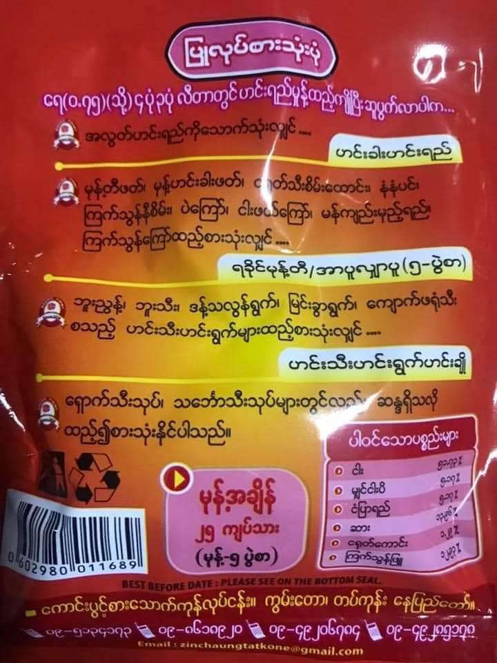 ပြည်တွင်းပြည်ပမှာ နာမည်ကြီးနေတဲ့ ဇင်ချောင်း အာပူလျှာပူ ရခိုင်မုန့်တီနှင့် စွယ်စုံရဟင်းရည်မှုန့် အထုပ်လေးတွေရပါပြီနော်။ ဒီတိုင်း ဟင်းခါးဟင်းရည်လေးပဲချက်စားလို့လည်းရတယ်။ မုန့်ဟင်းခါးဖတ် ငရုတ်သီးစိမ်းထောင်း မန်းကျည်းမှည့်ရည် ကြက်သွန်နီစိမ်း ပဲကြော် ငါးဖယ်ကြော် ကြက်သွန်နီဆီကျက် ကလေးနဲ့ဆို ရခိုင်မုန့်တီအရည် (၅ ဦးစာ ခန့်) (သို့) ရခိုင်မုန့်တီအသုပ် ပဲစားစား။ ဘူးသီး ဒန့်သလွန် မြင်းခွာ ကျောက်ဖယုံ စတဲ့အသီးအရွက်တွေနဲ့ ဟင်းခါးလေးချက်သောက်သောက်။ ရှောက်သီးသုပ်၊ ရခိုင် သင်္ဘောသီးထောင်း တို့မှာ ထည့်သုပ်သုပ် လွယ်ကူ အဆင်ပြေတယ်နော်။